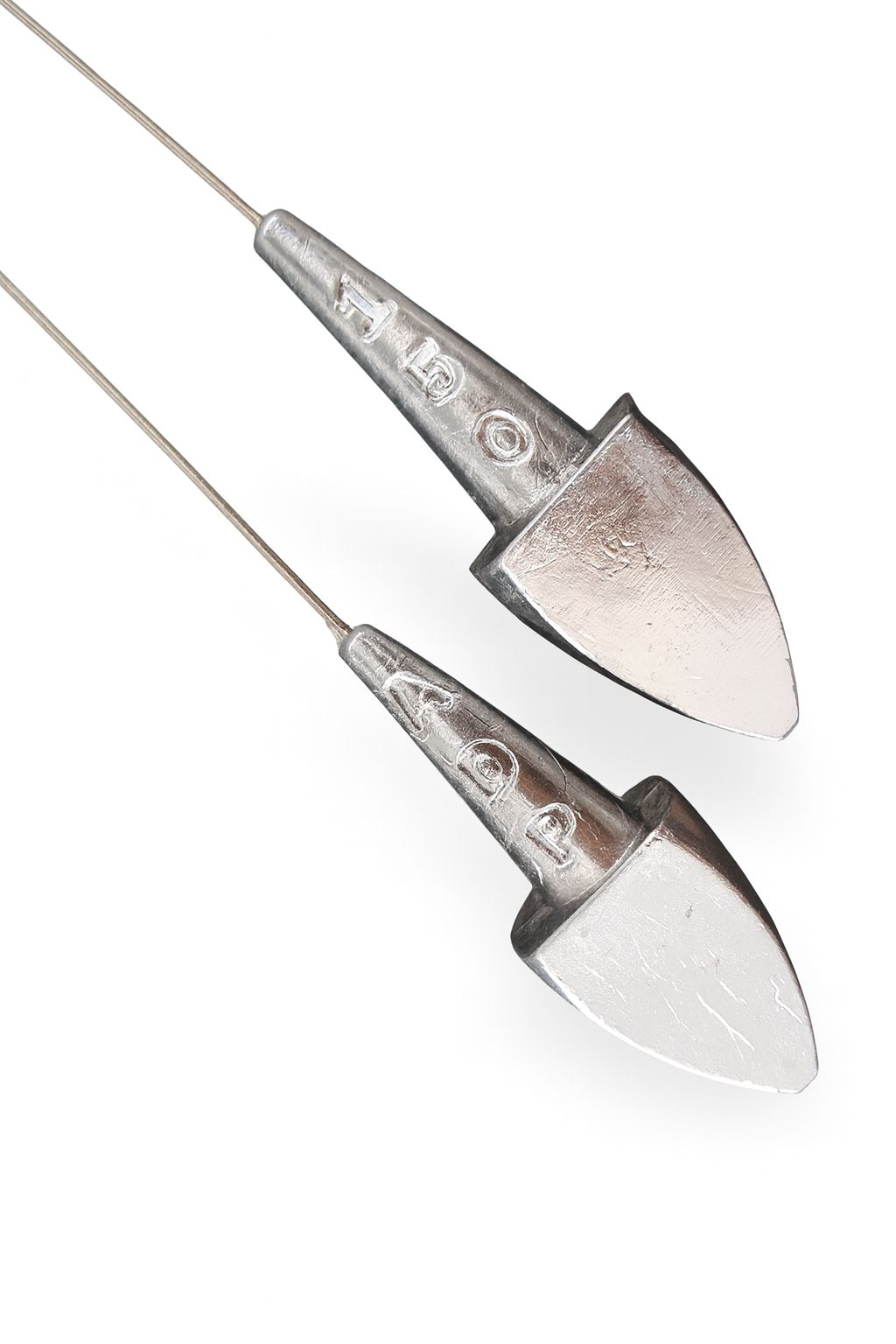 Dois pesos metálicos prateados para pesca, com inscrições 10 g e 4 g, cabo fino, fundo branco.