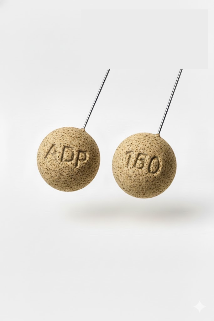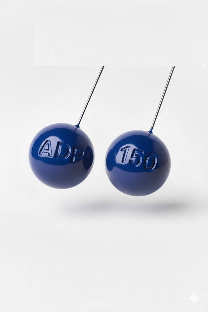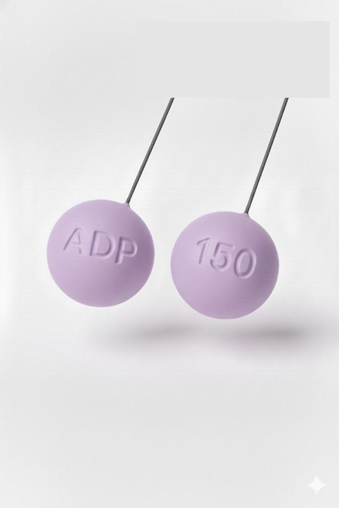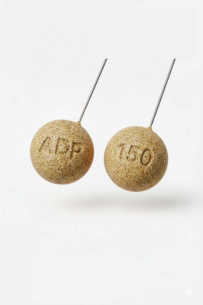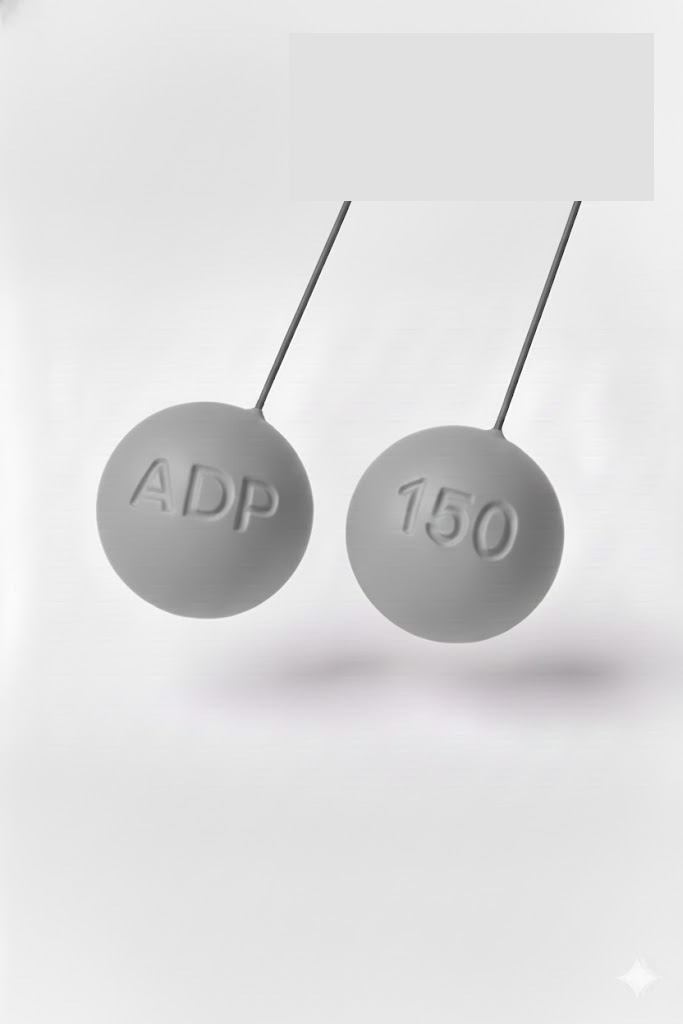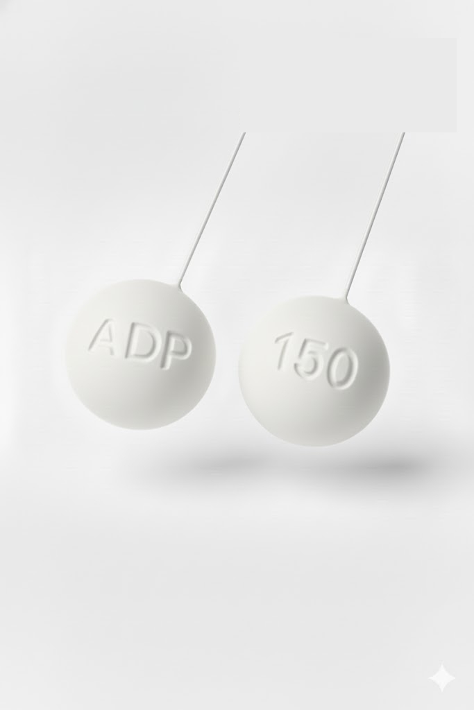 Dois comprimidos brancos redondos com inscrições em relevo ADP e 150 suspensos
