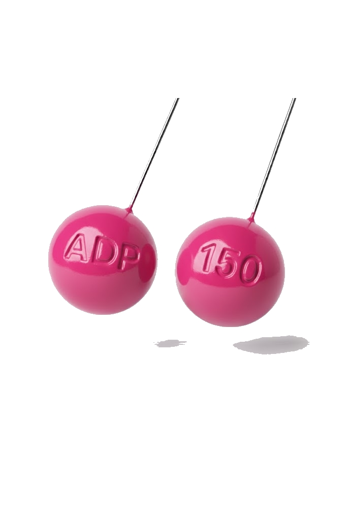 Duas bolas cinzentas suspensas com inscrições ADP e 150